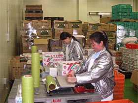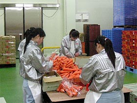 庫内温度10~13℃の冷蔵庫内で野菜のパッキングをします。